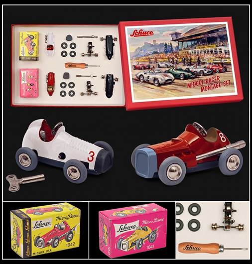 Coffret Voitures de course Vintage Micro Racer Avec 2 voitures de course Midget USA à monter Midget Racer 1041 n° 8 Rouge - Midget Racer 1042 n° 3 Blanche - Longueur 7 cm Pneus et pare-chocs caoutchouc - Livré avec boîtes de rangement vintage Instructions de montage et livret de jeu inclus Rouge / Blanc 1/45 - Schuco 450162000 Edition limitée - 1000 exemplaires 89,95 € TTC / Incl. Taxes