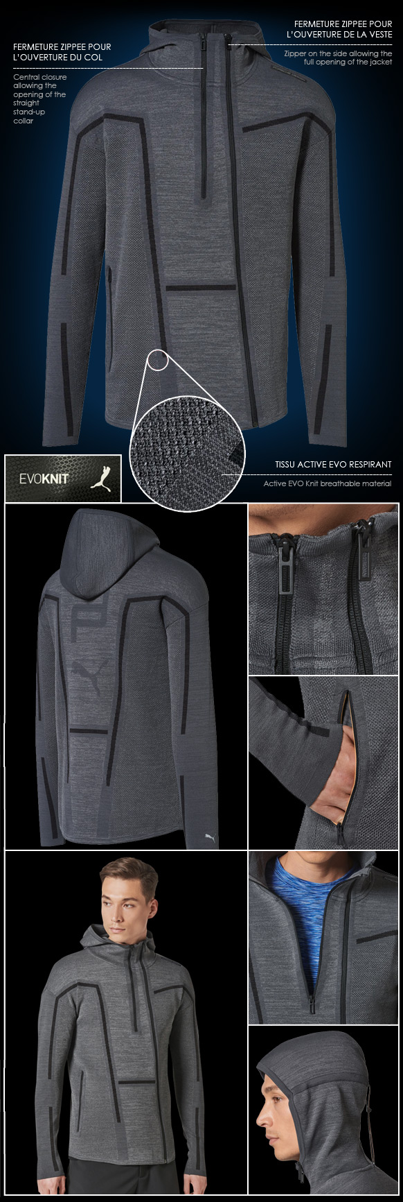 Veste sport Porsche Design Active EVO Knit by Puma - Tailles M / L seulement Couleur gris - Matière 71% polyamide / 25% polyester / 4% Elasthane Fermeture zippée sur le coté permettant l'ouverture complète de la veste Fermeture centrale permettant l'ouverture du col montant droit 1 poche latérale à fermeture zippée - Capuche ajustable Porsche Design 57858504