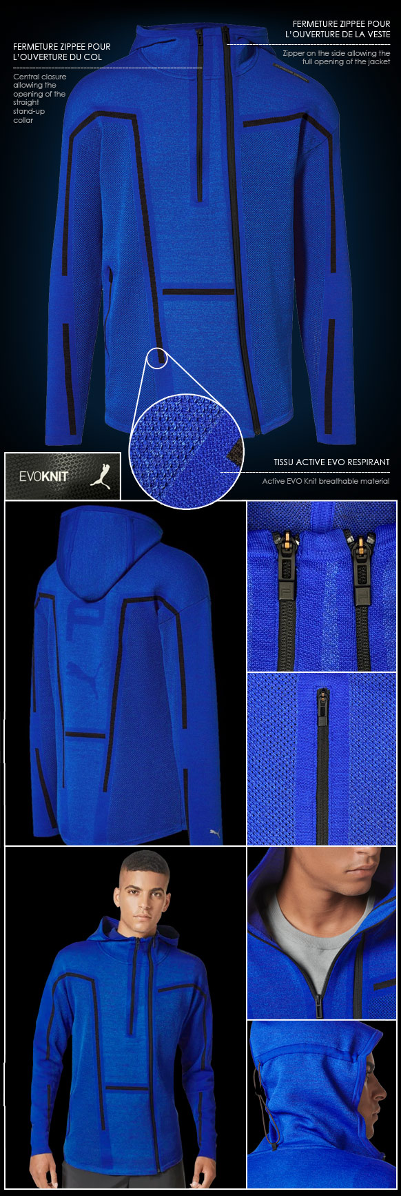 Veste sport Porsche Design Active EVO Knit by Puma - Tailles S / M / L seulement Couleur bleu - Matière 71% polyamide / 25% polyester / 4% Elasthane Fermeture zippée sur le coté permettant l'ouverture complète de la veste Fermeture centrale permettant l'ouverture du col montant droit 1 poche latérale à fermeture zippée - Capuche ajustable Porsche Design 57858508