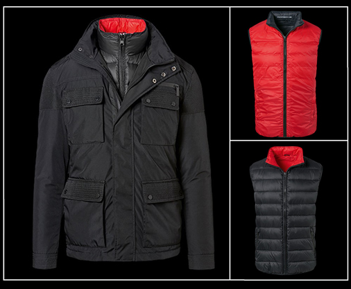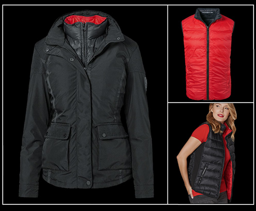 Veste homme Porsche 2 en 1 Multi usage - Tailles S / M / L seulement Gilet sans manches amovible - Couleur noir / doublure rouge Matière 100% polyamide / Gilet 100% Nylon Porsche WAP491