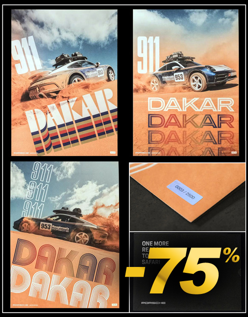 Set de 3 Posters Porsche 911 Dakar Impression de qualité premium sur papier épais 50 x 70 cm - vernis brillant structuré et gaufrage - Cadre non fourni Edition limitée - 2500 exemplaires numérotés avec hologramme Porsche WAP0925010PDKP