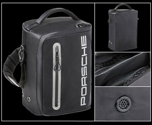 Sac pour Chaussures de Golf Porsche Matière Nylon / Polyester - Dimensions 18 x 36 x 35 cm - 2 zones d'aération Fermeture éclaire de la poche extérieure étanche - 1 poche extérieure Bandoulière amovible - Enduit en hydrofuge - Couleur Noir Porsche WAP0600040R0SB 149,95 € TTC / Incl. Taxes