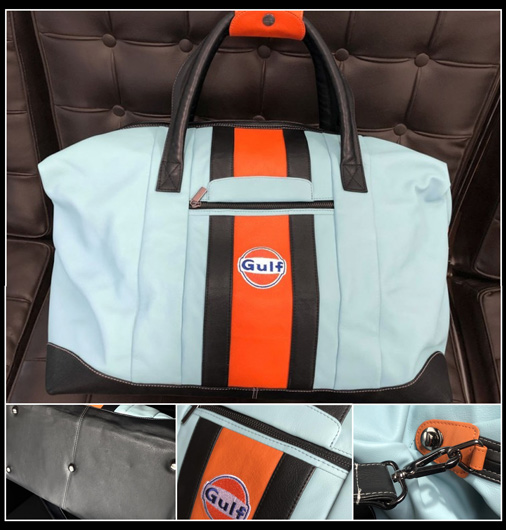 Sac de Voyage en cuir Gulf Large Bandoulière cuir réglable avec protection - Poignées cuir avec protection 2 poches zippées à l'extérieur - 2 poches à l'intérieur dont 1 zippée Fond renforcé avec pieds métal - Logos Gulf brodés Couleur bleu Gulf / intérieur orange - Matière 100% Cuir / Doublure 100% Coton Dimensions 55 x 36 x 25 cm 269 € TTC / Incl. Taxes