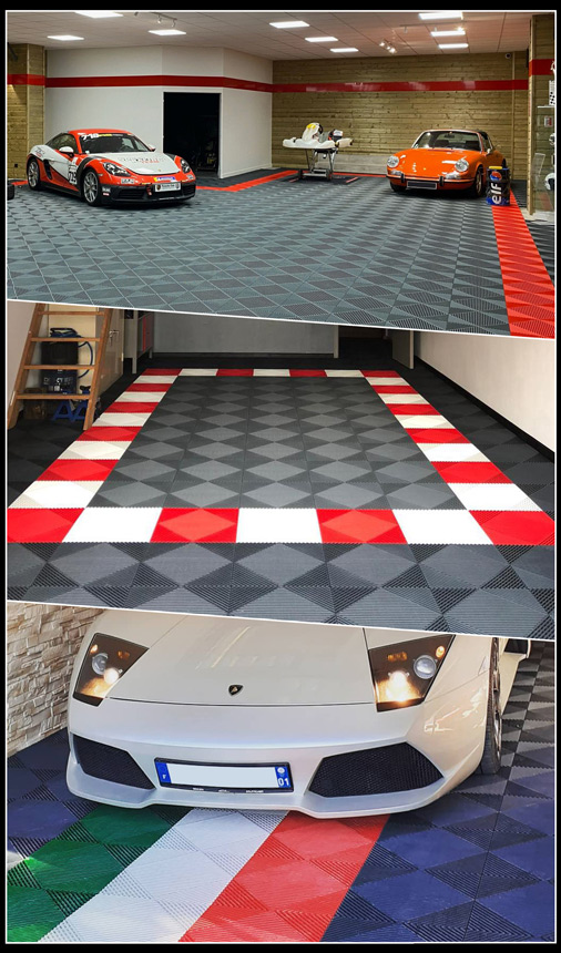These floor tiles are used by the major racing teams, such as Porsche, Mercedes, Audi, Alpine and so on
