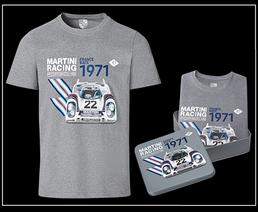 T-shirt mixte Porsche 917 KH n° 22 Martini Racing Présenté dans une boîte métallique exclusive - Carte descriptive Porsche 917 incluse Matière 100% Coton doux au toucher - Couleur Gris chiné Edition limitée - Porsche WAP558M0MR 54,95 € TTC / Incl. Taxes