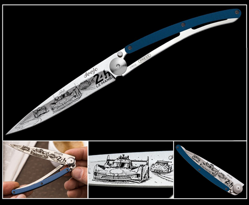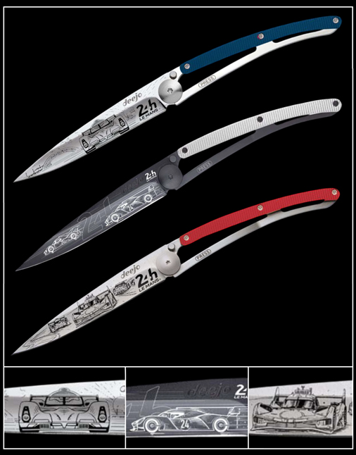 Set de 3 Couteaux Deejo 24h Le Mans Longueur fermé 11 cm - Lame en acier inoxydable gravée au laser - Poids 37g Manches en Aluminium Bleu / Blanc / Rouge - Longueur ouvert 20,5 cm Edition limitée - 240 exemplaires numérotés 299,95 € TTC / Incl. Taxes