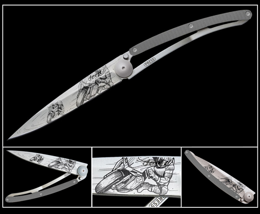 Couteau Deejo Moto Racing Longueur fermé 11 cm - Lame en acier inoxydable gravée au laser - Finition titane Manche en Aluminium - Longueur ouvert 20,5 cm - Poids 37g 79,95 € TTC / Incl. Taxes