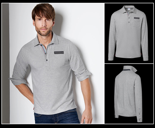 Polo manches longues homme Porsche Classic Couleur gris clair chiné - Discrets détails tricolores Matière 47,5 % coton / 47,5 % polyester / 5 % élasthanne Porsche WAP714K