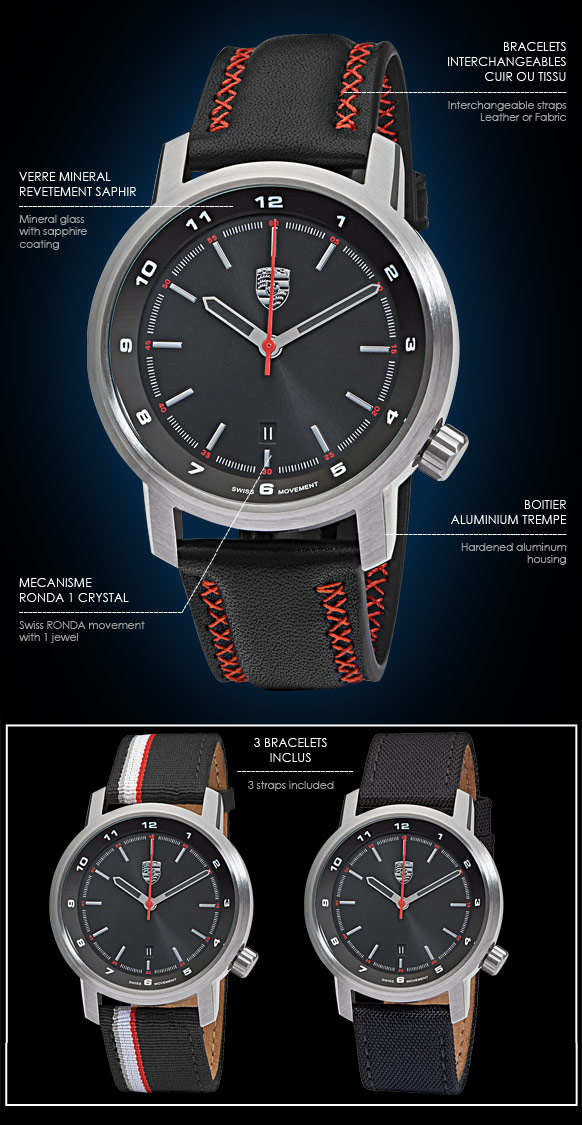 Montre Chronographe Porsche - Essential 911 Silver Edition Mouvement Suisse Ronda 1 cristal - Bracelet cuir noir, surpiqûres rouges Deux bracelets tissu avec mécanisme de remplacement rapide inclus Boucle ardillon acier inoxydable - Verre minéral avec revêtement saphir Etanche jusqu'à 10 ATM / 100 m - Diamètre 43 mm - Garantie 2 ans Porsche WAP0700010J