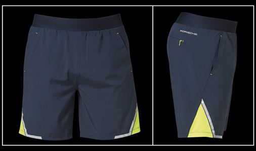 Short homme Porsche Sport En tissu perforé très respirant avec slip intégré - Couleur Bleu sombre / détails vert acide Séchage rapide pour un plus grand confort - Matière 90 % polyester / 10 % élasthanne 2 poches latérales / 1 poche arrière zippée Porsche WAP544K0SP