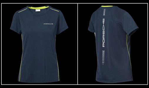 T-shirt femme - Porsche Sport T-shirt en piqué fonctionnel, élastique et respirant - Séchage rapide Imprimé réfléchissant au dos - Matière 95 % polyester / 5 % élasthanne Couleur Bleu foncé / détails vert acide Porsche WAP548J