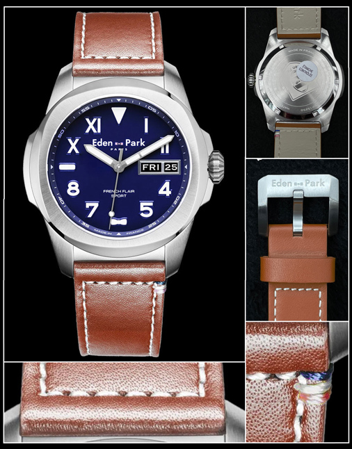 Montre Quartz Eden Park Création Michel Herbelin garde-temps - Fabriquée en France - Boîtier acier 43 mm Bracelet cuir marron / surpiqûres blanches - Cadran bleu foncé Verre minéral saphir antireflets - Boîtier étanche 100m - Garantie 2 ans Eden Park EP13250A15GD 229,95 € TTC / Incl. Taxes