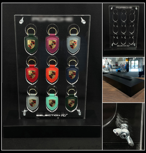 Présentoir à porte-clés Porsche Permet de présenter 9 porte-clés écusson Porsche - Vitre épaisse en plexiglas Socle en bois verni - Fermeture par vis oreilles - Porte-clés non inclus 159,95 € TTC / Incl. Taxes