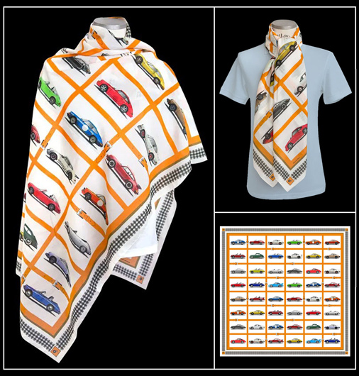Foulard écharpe Pepita Porsche 911 Couleur blanc et orange - Illustrations Porsche 911 Matière 70% coton / 30 % soie - Dimensions 138 x 138 cm Made in Italy 189,95 € TTC / Incl. Taxes