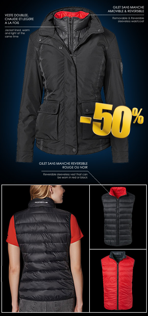 Veste Porsche 2 en 1 multi usage pour femme Veste doublée, chaude et légère à la fois - Gilet sans manches amovible Matière 100% polyamide / Gilet 100% Nylon - Couleur noir / doublure rouge Deux poches à rabat plaquées - Poches intérieures hanche et poitrine Porsche WAP492