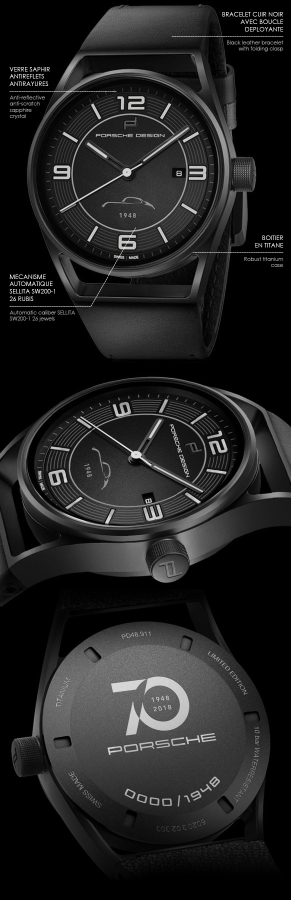 Montre automatique Porsche Design Datetimer 70Y Boitier robuste en titane, couronne vissé Rotor à optimisation d’énergie Porsche Design Mécanisme SELLITA SW200-1 26 rubis Bracelet en cuir noir avec boucle déployante Verre cristal saphir anti-reflets / anti-rayures Etanche 10 ATM - Diamètre : 42 mm Fabriqué en Suisse - Garantie 2 ans Série limitée à 1948 exemplaires numérotés Porsche Design 4046901847777 2949,95 € TTC / Incl. Taxes