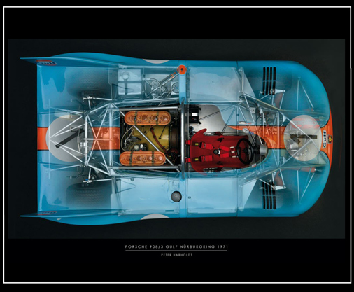 Reproduction exclusive d'un montage original de Peter Harholdt - Porsche 908 Gulf n°1 40 x 60 cm - Impression sur Plexiglass Kit d'accrochage vendu séparément 49,95 € TTC / Incl. Taxes