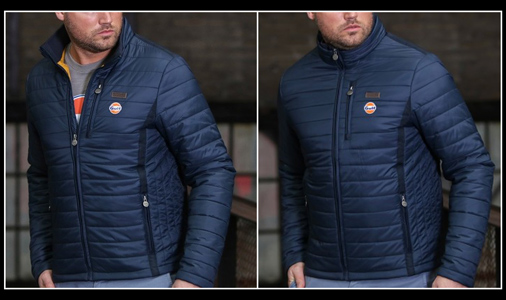 Veste homme Gulf Performance Couleur bleu marine - Matière 100% nylon doux 2 poches zippées latérales - Poche zippée sur la poitrine et à l'intérieur Pin Gulf amovible - Col droit