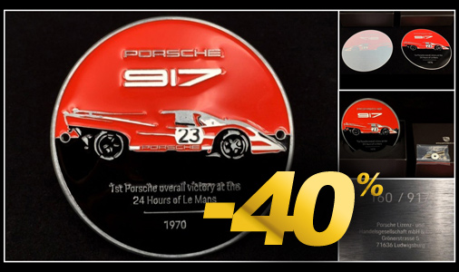 Duo Badges de grille Porsche 917 - 24h Le Mans 1970 Fabriqué en métal - Diamètre 9 cm - Kit de fixation inclus Inclus 1 autocollant pour l'extérieur, 1 autocollant pour l'intérieur des vitres Made in Germany - Porsche WAP0509170MSZG