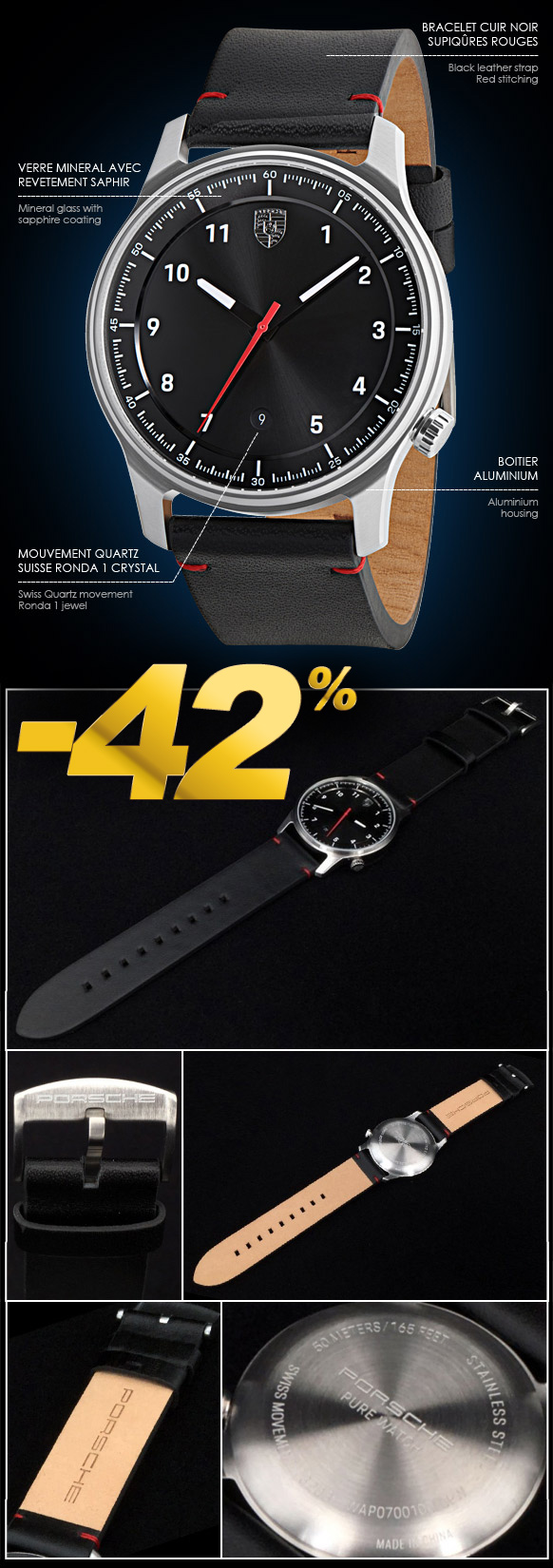 Montre Porsche Pure Watch Mouvement quartz Suisse Ronda 1 cristal - Boîtier aluminium trempé Bracelet cuir noir / surpiqûres rouges - Verre minéral avec revêtement saphir Cadran noir avec écusson Porsche - Boîtier étanche 5 ATM Diamètre 43 mm - Hauteur 10 mm - Garantie 2 ans Porsche WAP0700100L0PW