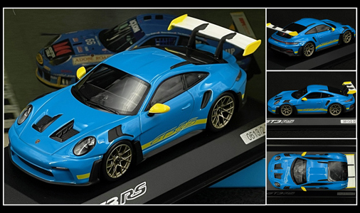 Porsche 911 GT3 RS 2023 - Hommage Vainqueur 24h Daytona 2003 Bleu Riviera / Jaune Racing 1/18 - Minichamps WAP0215110SGT3 Edition limitée - 992 exemplaires numérotés 299,95 € TTC / Incl. Taxes