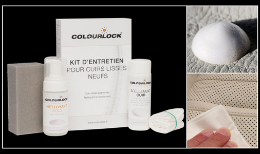 Kit d'entretien du Cuir - Colourlock Contient un Nettoyant et une Lotion de protection Une goutte d’eau reste en surface et ne pénètre pas Pour cuirs lisses unis et satinés - Avec nettoyant puissant Quantités suffisantes pour traiter un intérieur complet de voiture Colourlock - Made in Germany 29,95 € TTC / Incl. Taxes