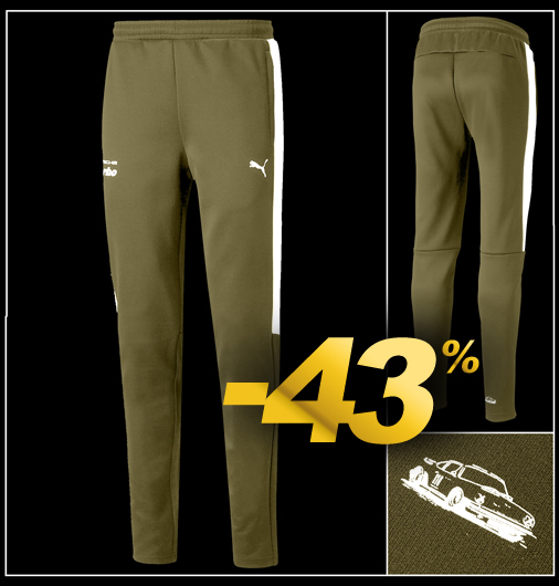 Pantalon homme Porsche Turbo by Puma Taille élastiquée avec cordon de serrage - 2 poches zippées Couleur Vert Olive / Blanc / Jaune - Matière 66% Polyester / 34 % Coton Puma 533783-03