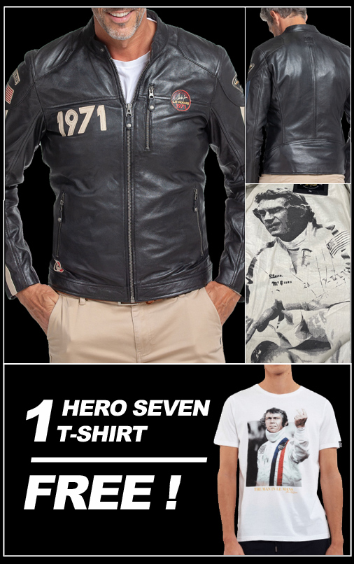Veste en cuir homme Steve McQueen 24h Le Mans Matière 100% cuir d'agneau de qualité - Doublure 100% coton Intérieur complet à l'effigie de Steve McQueen Nombreux détails surpiqués - Couleur Noir