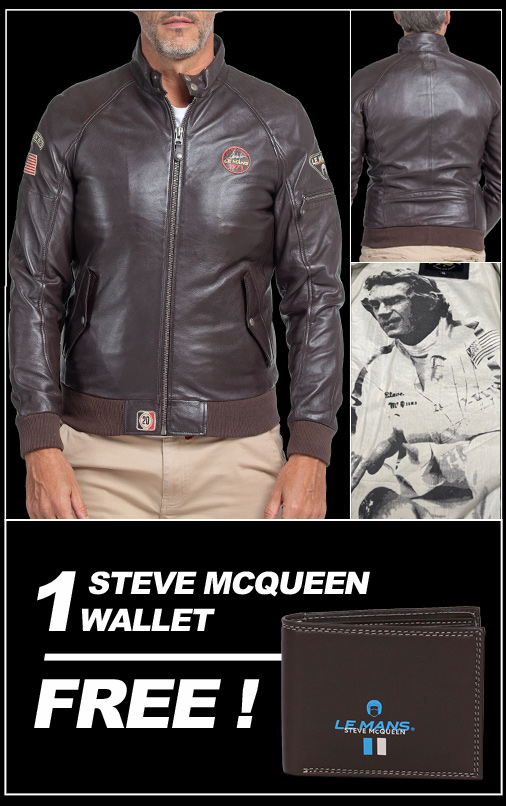 Veste en cuir homme Steve McQueen 24h Le Mans Matière 100% cuir d'agneau de qualité - Doublure 100% coton Intérieur complet à l'effigie de Steve McQueen Nombreux détails surpiqués - Couleur marron