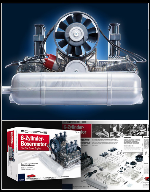 Moteur Porsche Boxer Flat-6 - Réplique entièrement fonctionnelle 290 pièces à monter soi-même - Socle de présentation inclus Bouton de mise en marche avec cycle "son et lumières" Reproduction sonore du moteur - Fonctionne avec 3 piles AAA Superbe manuel illustré en anglais et allemand, format A4 1/4 - Porsche MAP09028016