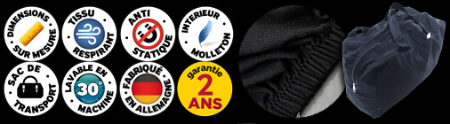 Housse de protection - Respirante pour l'intérieur Qualité Premium - Adaptée sur mesure aux contours du véhicule Matière tissu polyester micro-aéré et antistatique 160 g/m² Intérieur doux et souple style molleton - Sac de transport inclus Couleur noir - Fabriqué en Allemagne