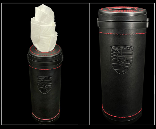 Boîte de Mouchoirs Porsche Extérieur 100% cuir de vachette - Intérieur résine - Surpiqûres rouges Couleur Noir - Hauteur 17,5 cm - Diamètre 6,5 cm Mouchoirs non inclus Porsche WAP0500080PTTB 49,95 € TTC / Incl. Taxes