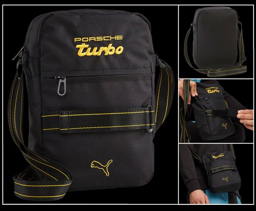Sacoche à bandoulière Porsche Turbo by Puma Grand compartiment zippée - Bandoulière réglable - 1 poche zippée devant Matière Toile enduite 88% polyester / 12% polyurethane - Couleur Noir / Jaune Sangle velcro de renfort sur le devant - Dimensions 17,5 x 7 x 25,5 cm Puma 079835_01 29,95 € TTC / Incl. Taxes