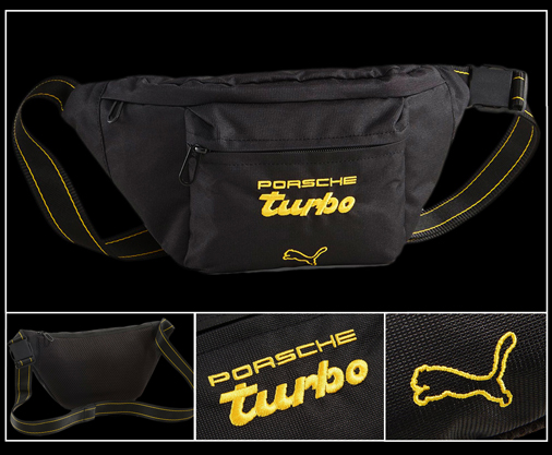 Sac banane Porsche Turbo by Puma Grand compartiment zippée - Ceinture réglable - 1 poche zippée devant Matière Toile enduite 88% polyester / 12% polyurethane - Couleur Noir / Jaune Dimensions 17,5 x 7 x 25,5 cm Puma 079836_01 29,95 € TTC / Incl. Taxes