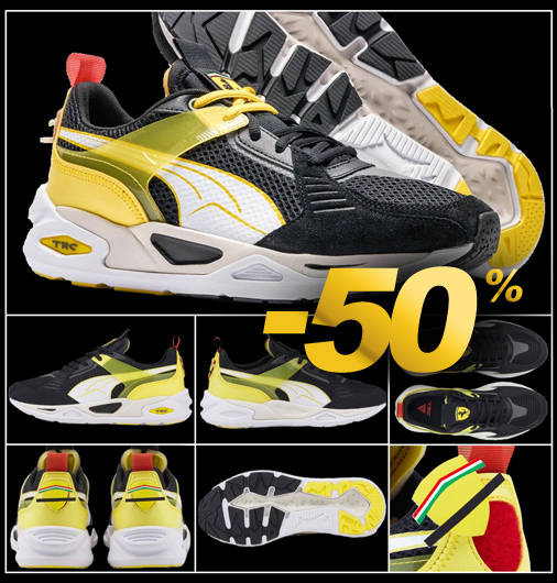 Chaussures homme Ferrari TRC Blaze by Puma Matière Mesh / Simili cuir / Caoutchouc - Semelle épaisse amorti spécial confort Talon et bout renforcés - Couleur Noir / Blanc / Jaune Puma 307322-01