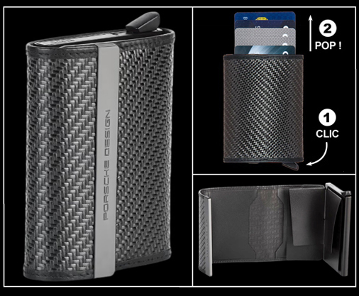 Portefeuille / Porte-cartes Cuir & Carbon Porsche Design Pop Up X Secrid Mécanisme d'extraction de 4/6 cartes en un seul mouvement - Couleur Noir Dimensions fermées 6,5 x 9,5 x 2 cm - Dimensions ouvertes 23,5 x 10 cm Protection de bloqueur RFID - Matière Carbone / Cuir de vache Monogramme Porsche Design gravé sur la plaque en bronze Porsche Design 4056487068671 164,95 € TTC / Incl. Taxes