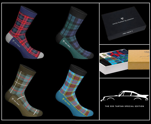 Set de 4 paires de Chaussettes inspiration Porsche 930 Turbo Matière 80% coton peigné / 17% Polyamide / 3% Elasthanne - Bleu Shottenkaro Tartan Bleu Black Watch Tartan - Vert Code 064 Tartan - Jaune Magnus Walker Tartan Tricoté en continu sans coutures 49,95 € TTC / Incl. Taxes