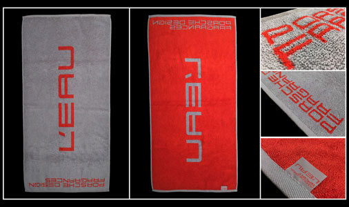 Serviette de Toilette Porsche L'Eau Toucher velours éponge Couleur gris clair / rouge Matière 100% Coton Dimensions 100 x 50 cm 19,95 € TTC / Incl. Taxes