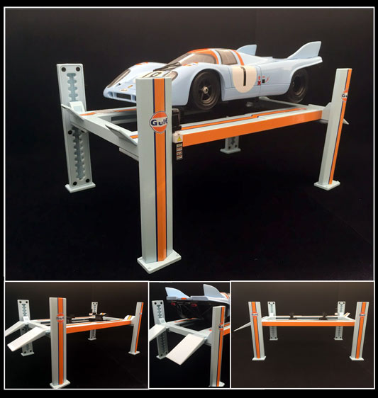 Pont élévateur 4 colonnes bleu Gulf 1/18 En métal de grande qualité - Réglable en hauteur Produit sous licence officielle Gulf Voiture non fournie, présentée à titre d'exemple 59,95 € TTC / Incl. Taxes
