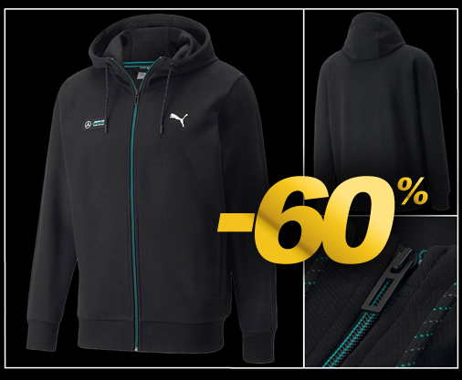 Hoodie homme Mercedes-AMG F1 Team Veste à capuche - Matière 72% Coton / 28% Polyester Fermeture par zip - 2 poches latérales zippées - Couleur Noir Puma 533607-01