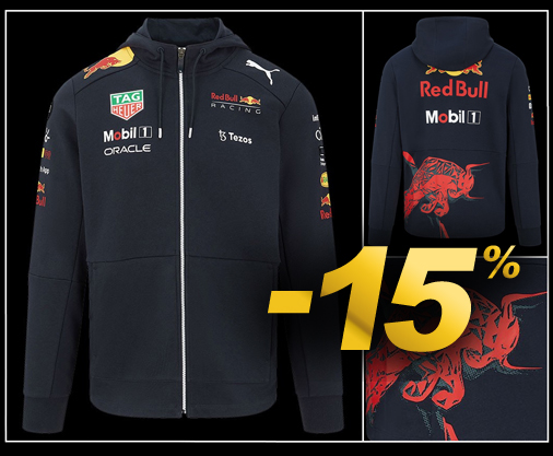 Veste homme Red Bull Racing F1 Verstappen Pérez Puma Tag Heuer Fermeture principale par zip - Capuche réglable avec cordon de serrage 2 Poches passepoilées - Couleur : Bleu Marine - Matière : 68% coton / 32% polyester Red Bull - 701220966-001