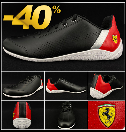 Chaussures Homme Ferrari Ridge Cat by Puma Couleur Noir / Rouge / Blanc - Matière principale cuir - Semelle sculptée comme un pneu Renfort au talon - Coupe basse - Licence officielle Scuderia Ferrari