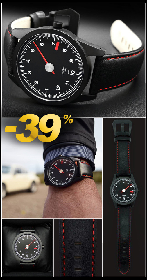 Montre compte-tours mono-aiguille Inspiration Porsche Mouvement quartz Ronda 762 Swiss-made - Bracelet cuir noir avec surpiqures rouges Boitier en acier inoxydable PVD noir - Saphir très résistant, traité anti-rayures et anti-reflets Etanche jusqu'à 10 ATM - Diamètre 43 mm - Garantie 12 mois Livré dans sa boite de présentation