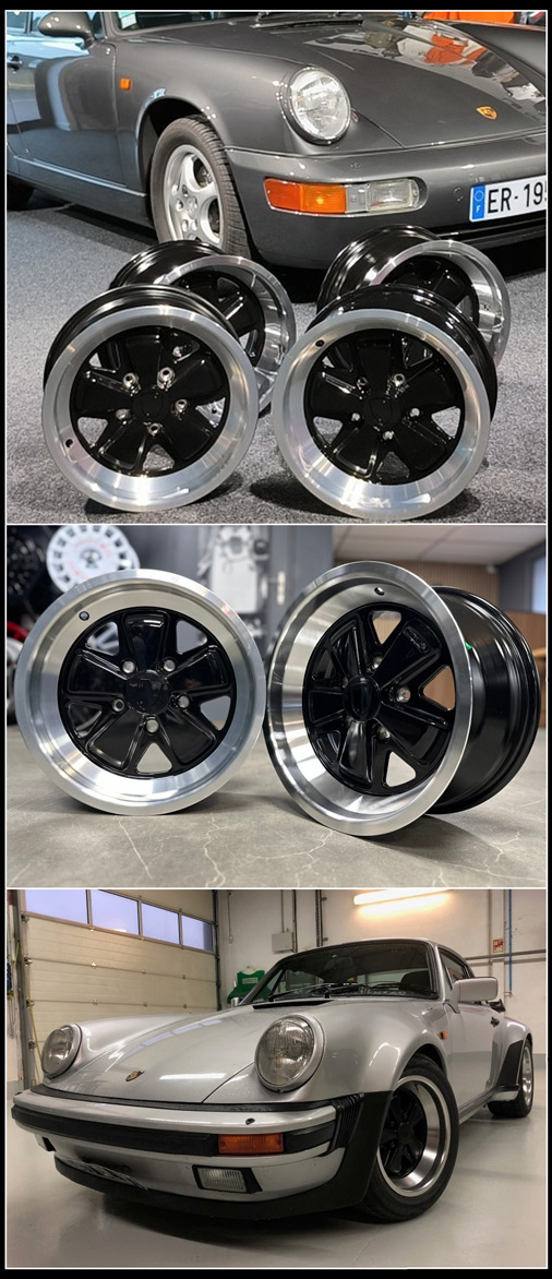 Lot de 4 Jantes 16" 5x130 compatibles avec Porsche 911 équipée Fuchs Inspiré du design légendaire des jantes des Porsche des années 70 et 80 Matériau Alliage léger haut de gamme - Finition Argent Poli / Noir effet brillant Traitement anti-corrosion et durabilité exceptionnelle Poids Environ 15 kg - Dimensions 7/16 ET23.3 + 8/16 ET10.6 Dimensions conformes à la monte d'origine Porsche These rims are not approved for use in Germany and Switzerland Diese Felgen sind nicht für Deutschland und die Schweiz zugelassen Ces jantes ne sont pas homologuées pour l'Allemagne et la Suisse 1199,95 € TTC / Incl. Taxes