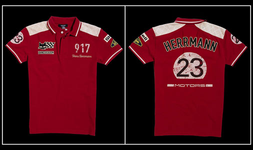 Polo homme Hans Herrmann 917 n°23 - 24h Le Mans 1970 Effet matelassé sur les épaules - Couleur : rouge - 100% coton Signature Hans Herrmann et 917 sur la poitrine