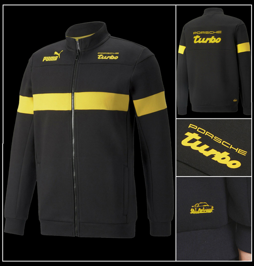 Veste homme Porsche Turbo by Puma 2 poches latérales - Taille et manches élastiquées - Fermeture par zip Couleur Noir / Jaune - Matière : 77% coton / 23% polyester Puma 533779-01