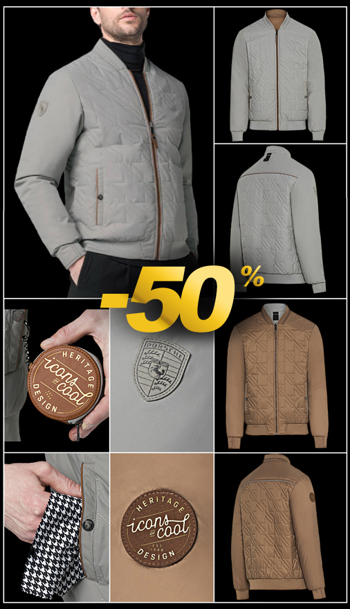 Veste réversible homme Porsche 911 Heritage Sport Classic Porte-monnaie et chiffon de nettoyage pied de poule carré pour lunettes inclus Matière 100% polyester - Couleur Gris / Havane - Bords cote poignets, col et ceinture 2 poches latérales à pressions - Boucle "Icons of Cool" dans le cou Porsche WAP322PHRT