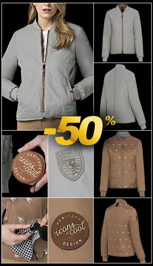 Veste réversible femme Porsche Heritage 911 Sport Classic Porte-monnaie et chiffon de nettoyage pied de poule carré pour lunettes inclus Matière 100% polyester - Couleur Gris / Havane - Bords cote poignets, col et ceinture 2 poches latérales à pressions - Boucle "Icons of Cool" dans le cou Porsche WAP323PHRT