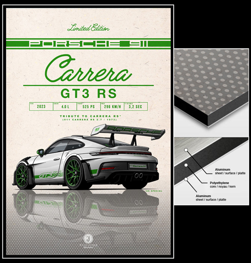 Reproduction d'un dessin original de Helge Jepsen Porsche 911 GT3 RS 2023 US Version - Gris Glacé / Bandes Vert Python 40 x 60 cm - Impression sur aluminium Kit d'accrochage vendu séparément 69,95 € TTC / Incl. Taxes