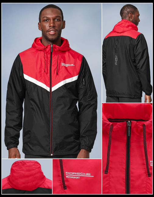 Veste à capuche homme Porsche Motorsport Coupe vent et imperméable / effet déperlant - Matière 100% Polyester Capuche et possibilité de resserrer la veste au niveau de la ceinture 2 grandes poches latérales zippées - Couleur Noir / Rouge Fermeture par zip - Porsche WAP123NFMS 119,95 € TTC / Incl. Taxes